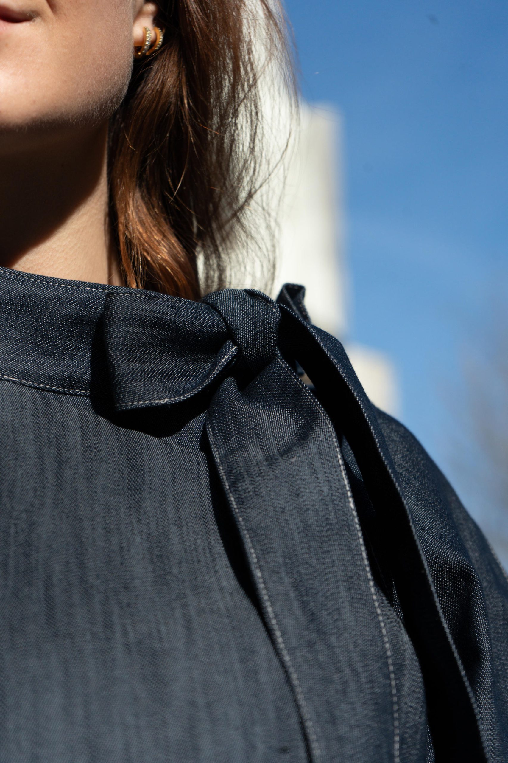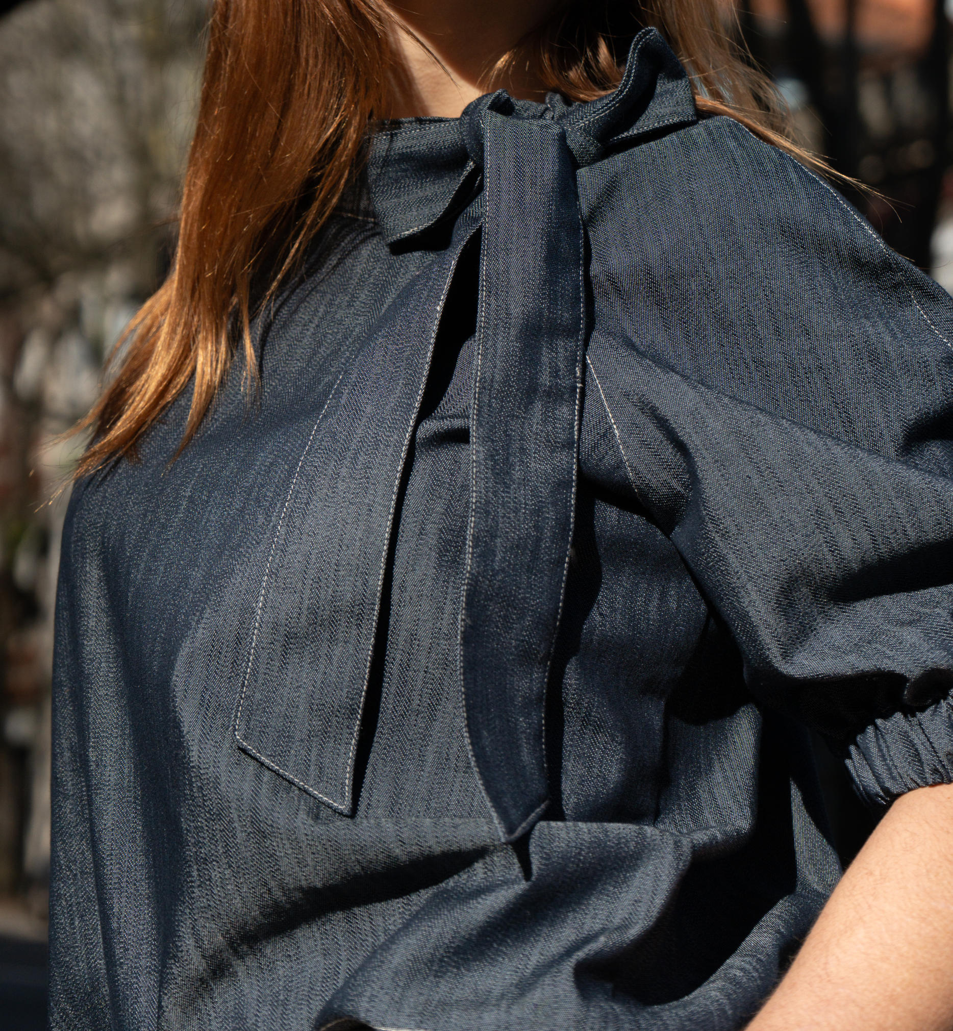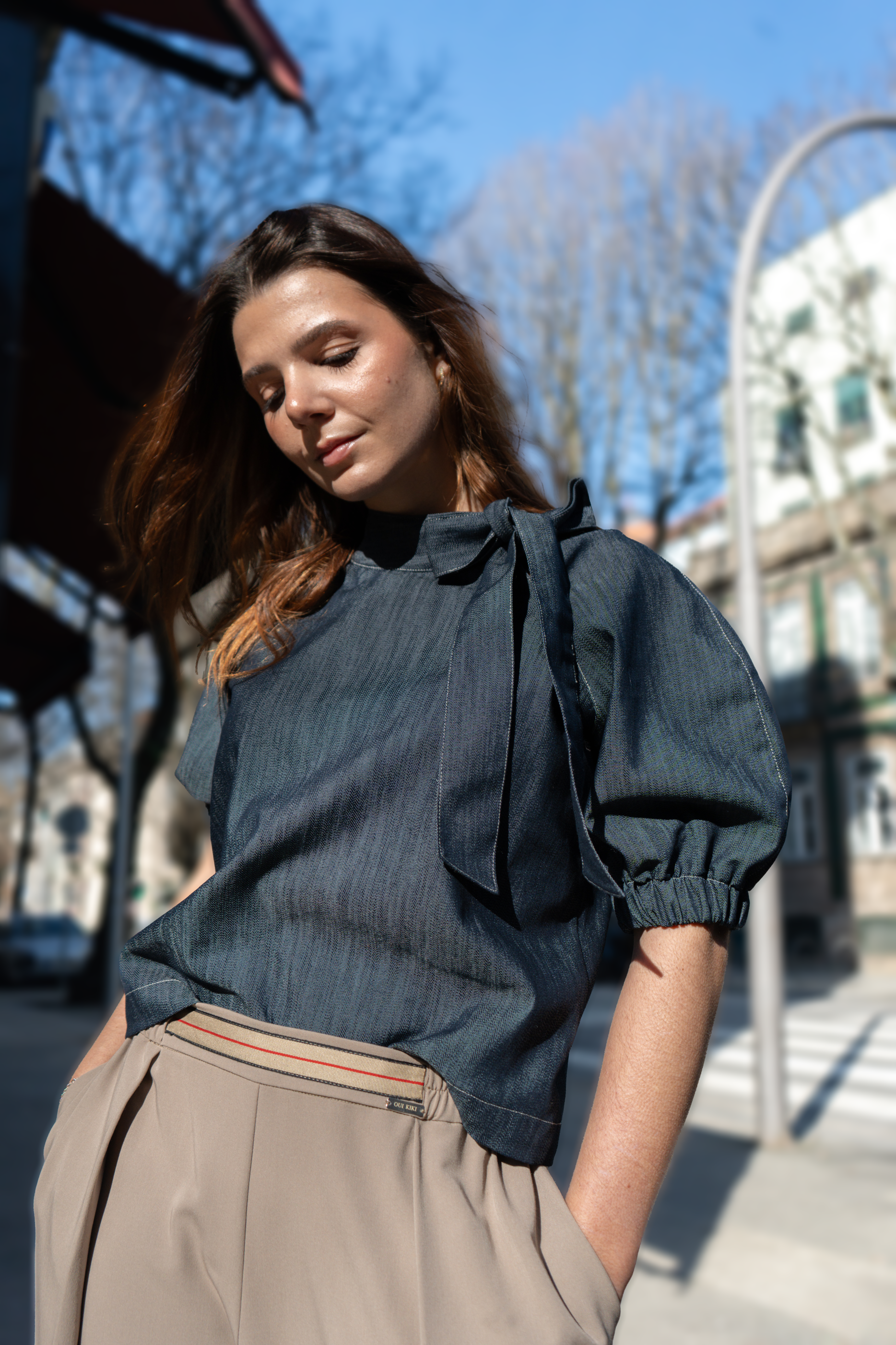 Blusa de ganga, gola a fechar com laçada , manga balão com elástico.