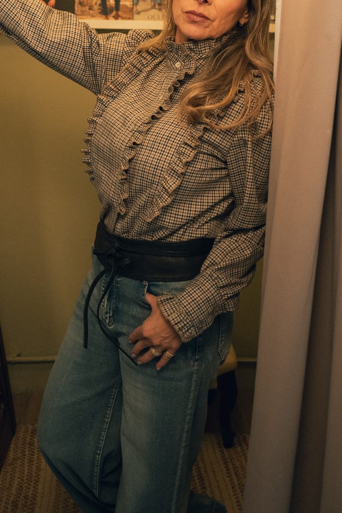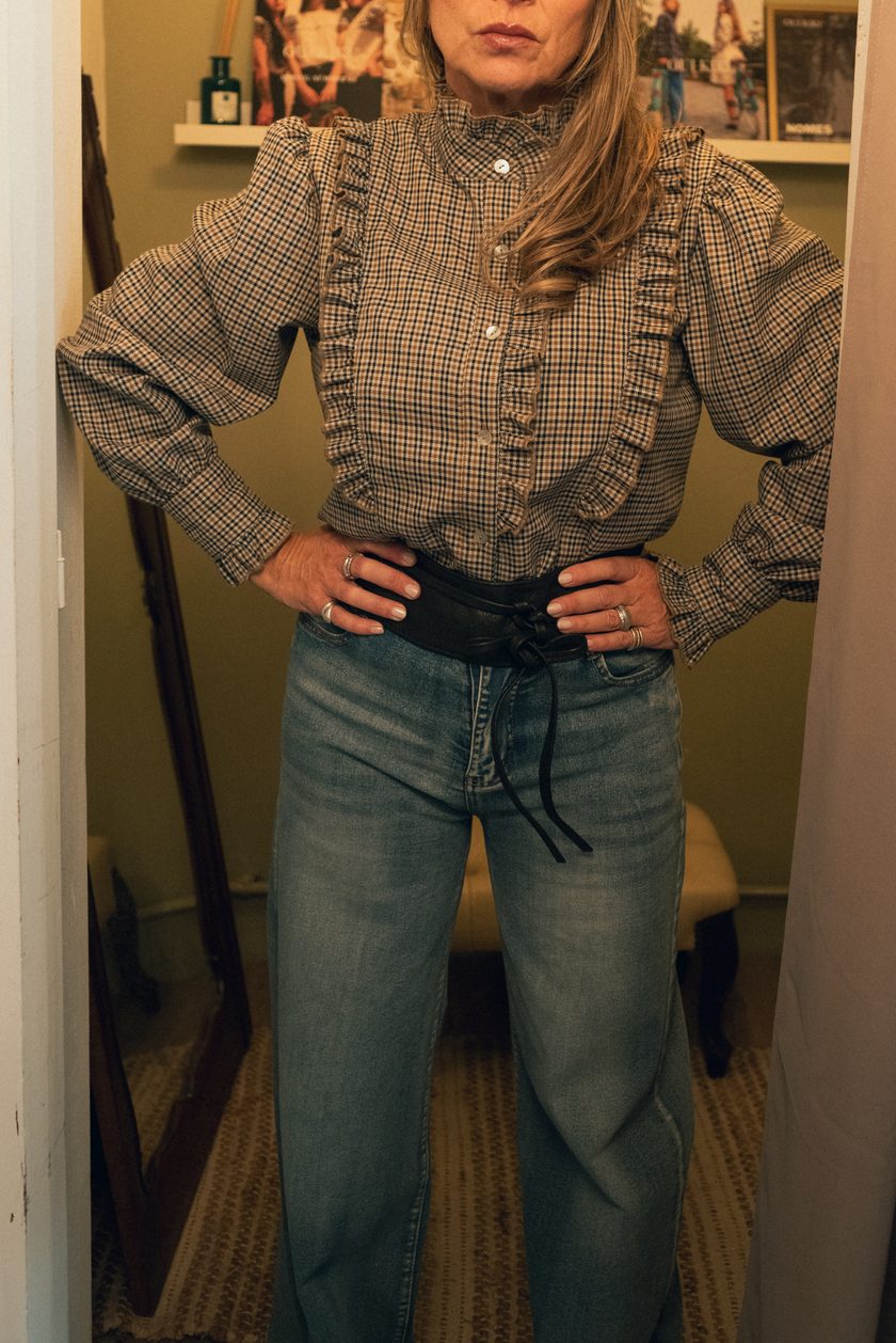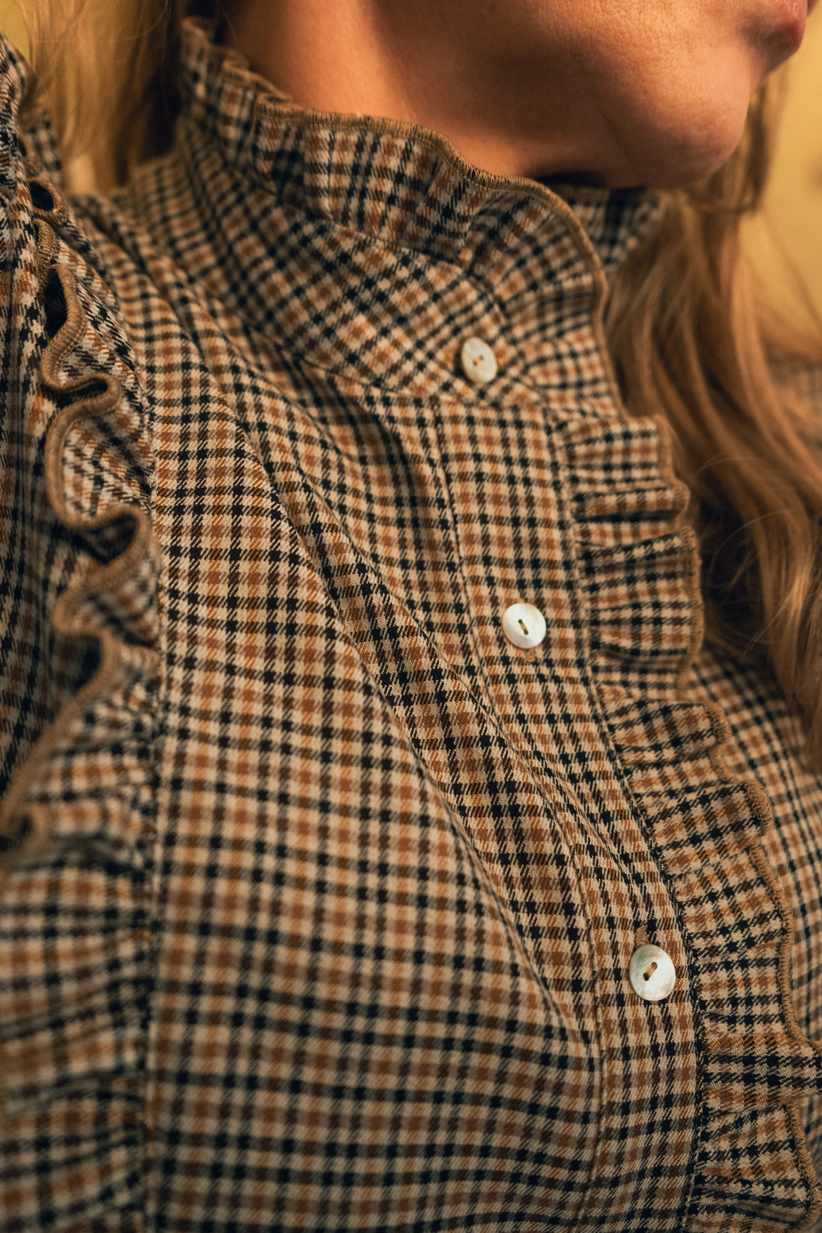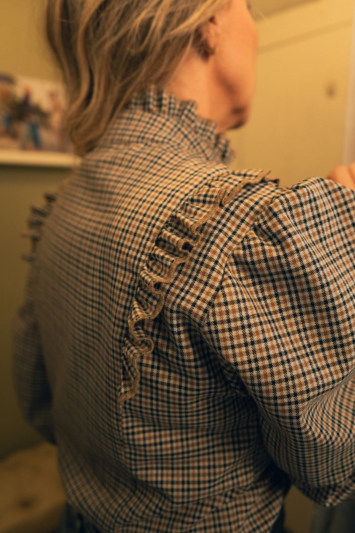 Camisa com folho na gola , punho , frente e costas, botões madrepérola.