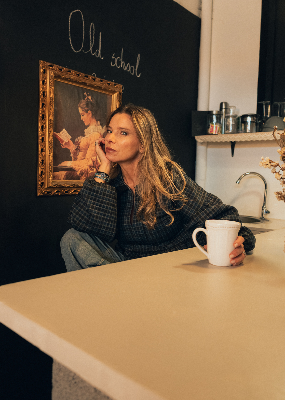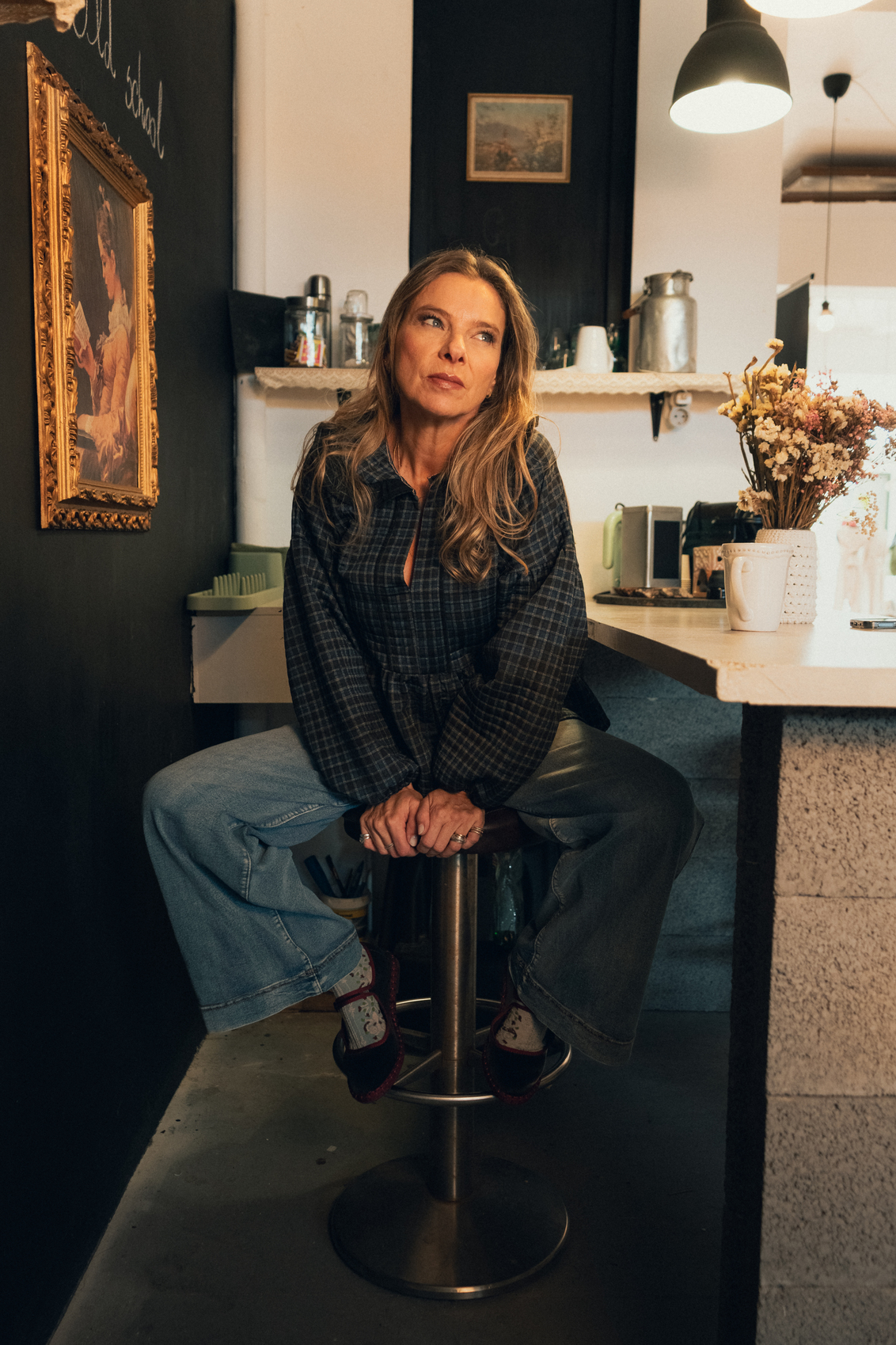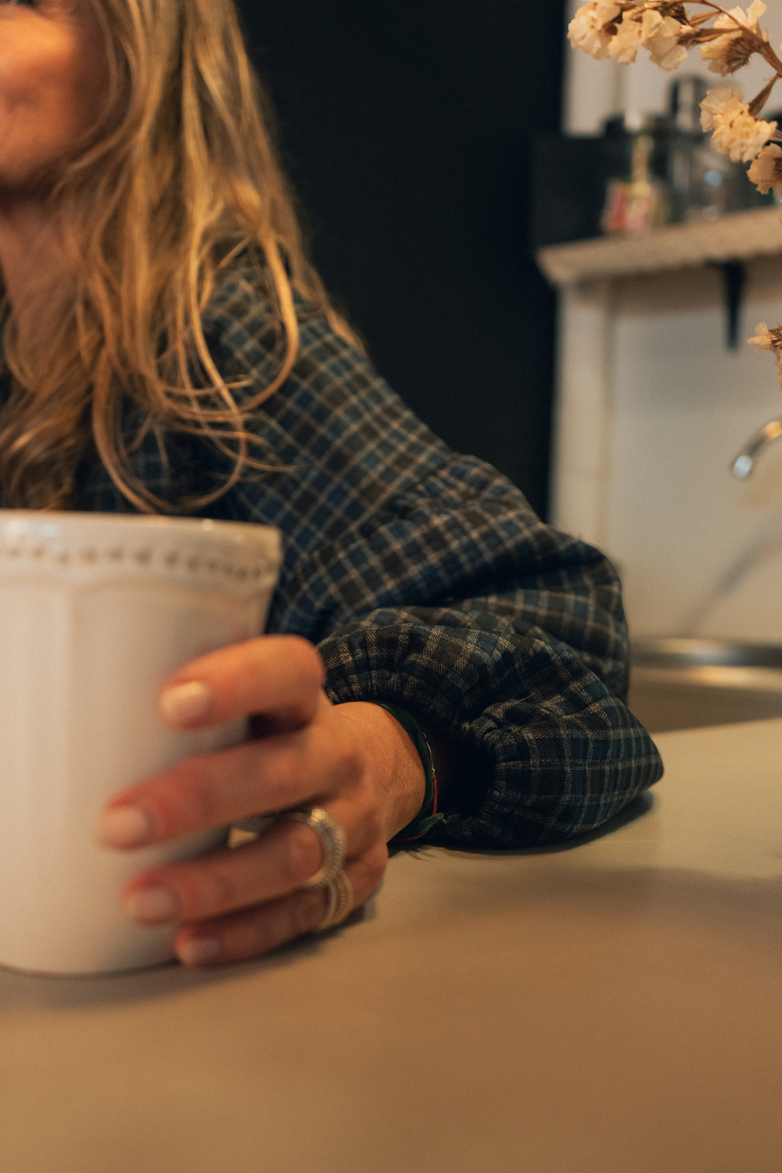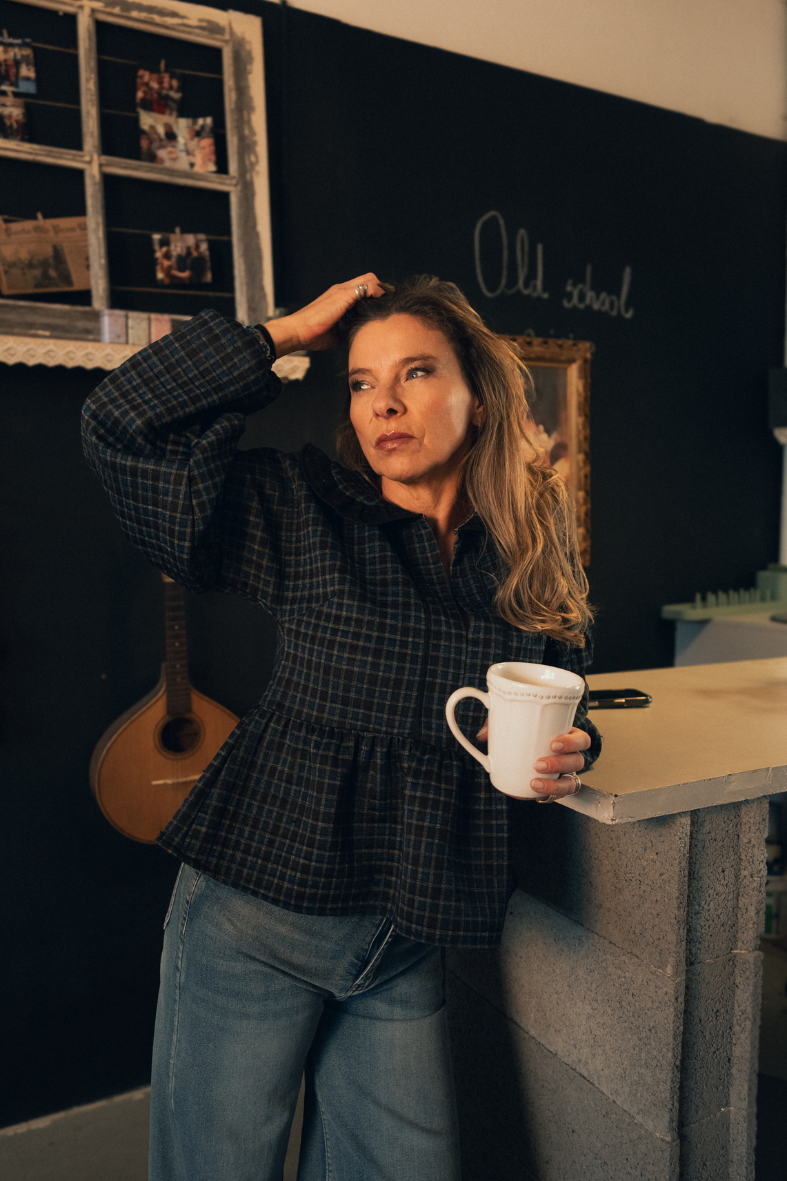 Blusa xadrez , gola redonda com detalhe folho às riscas, manga punho elástico