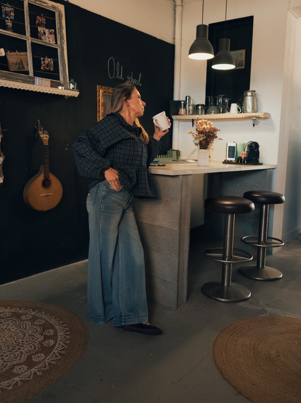 Calça ganga, cinta subida, bolso com coroa, corte regular com virola.