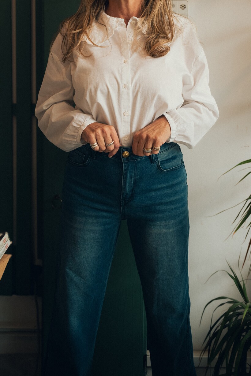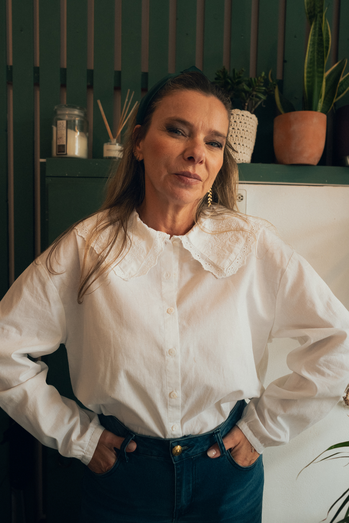 Camisa branca com gola redonda , botões madrepérola e punho com botão.