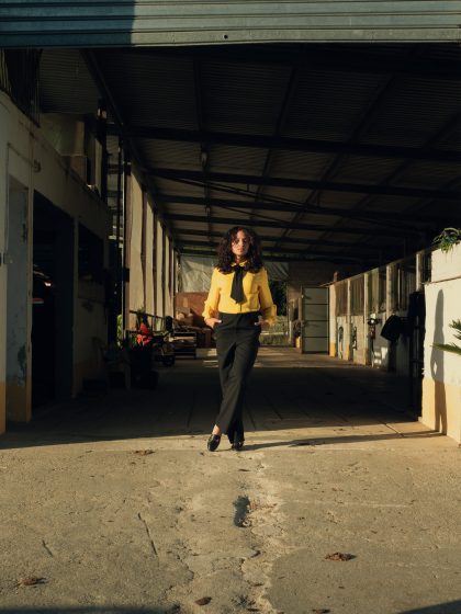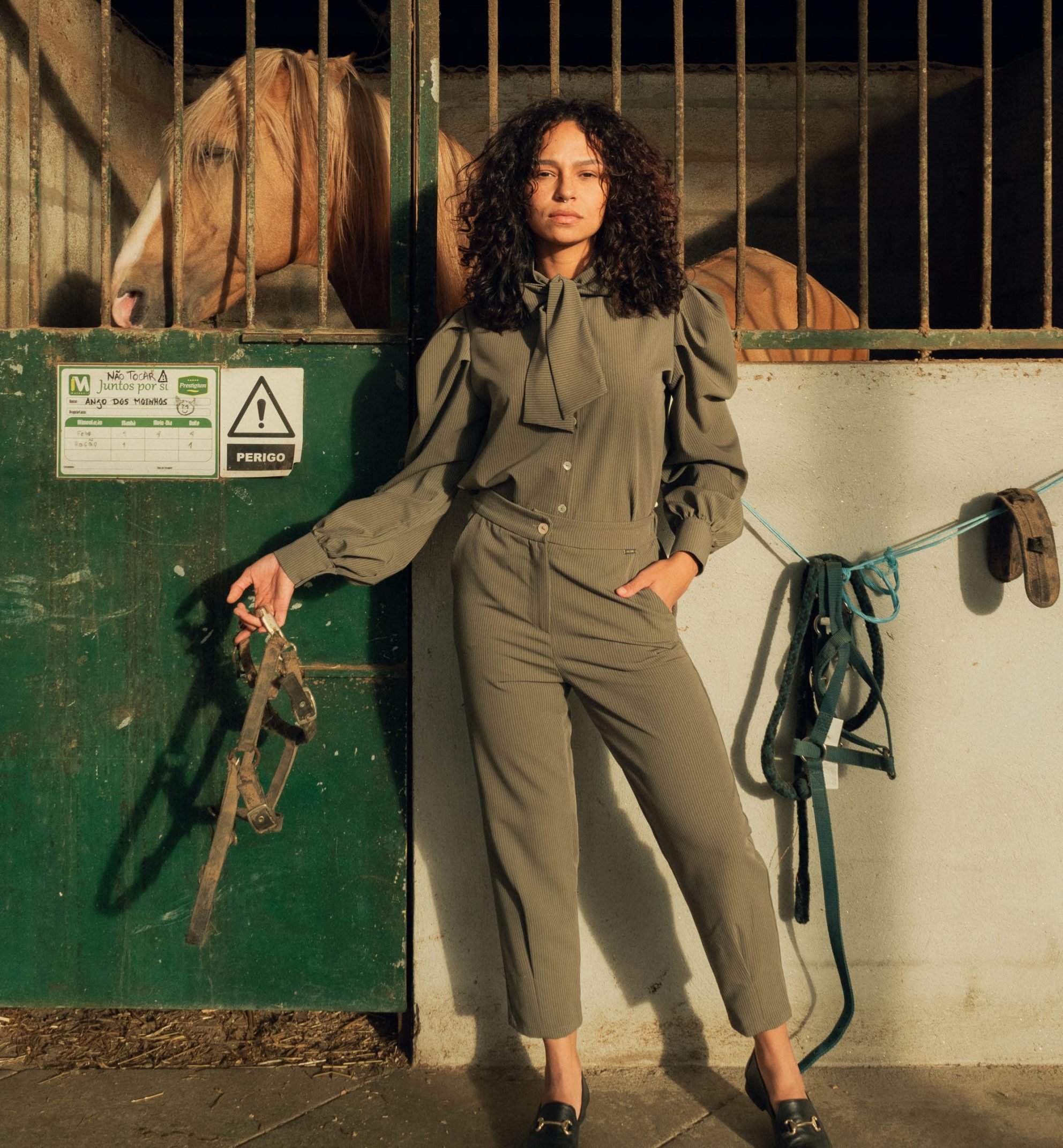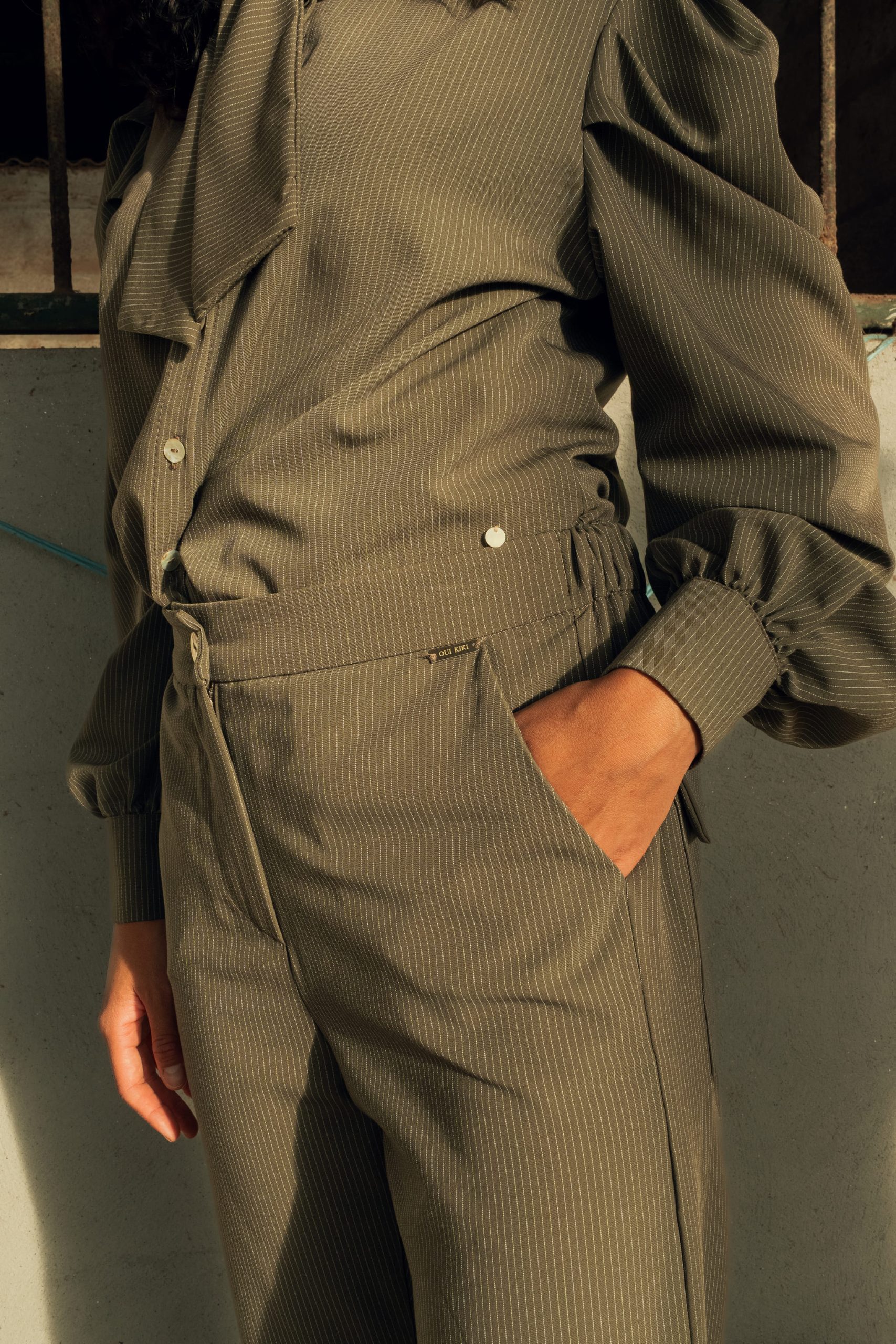 Camisa laçada, risca diplomática, manga balão, botões madrepérola.