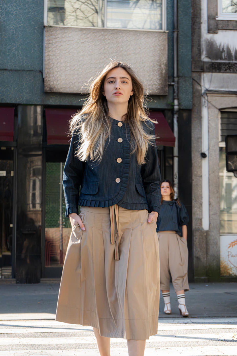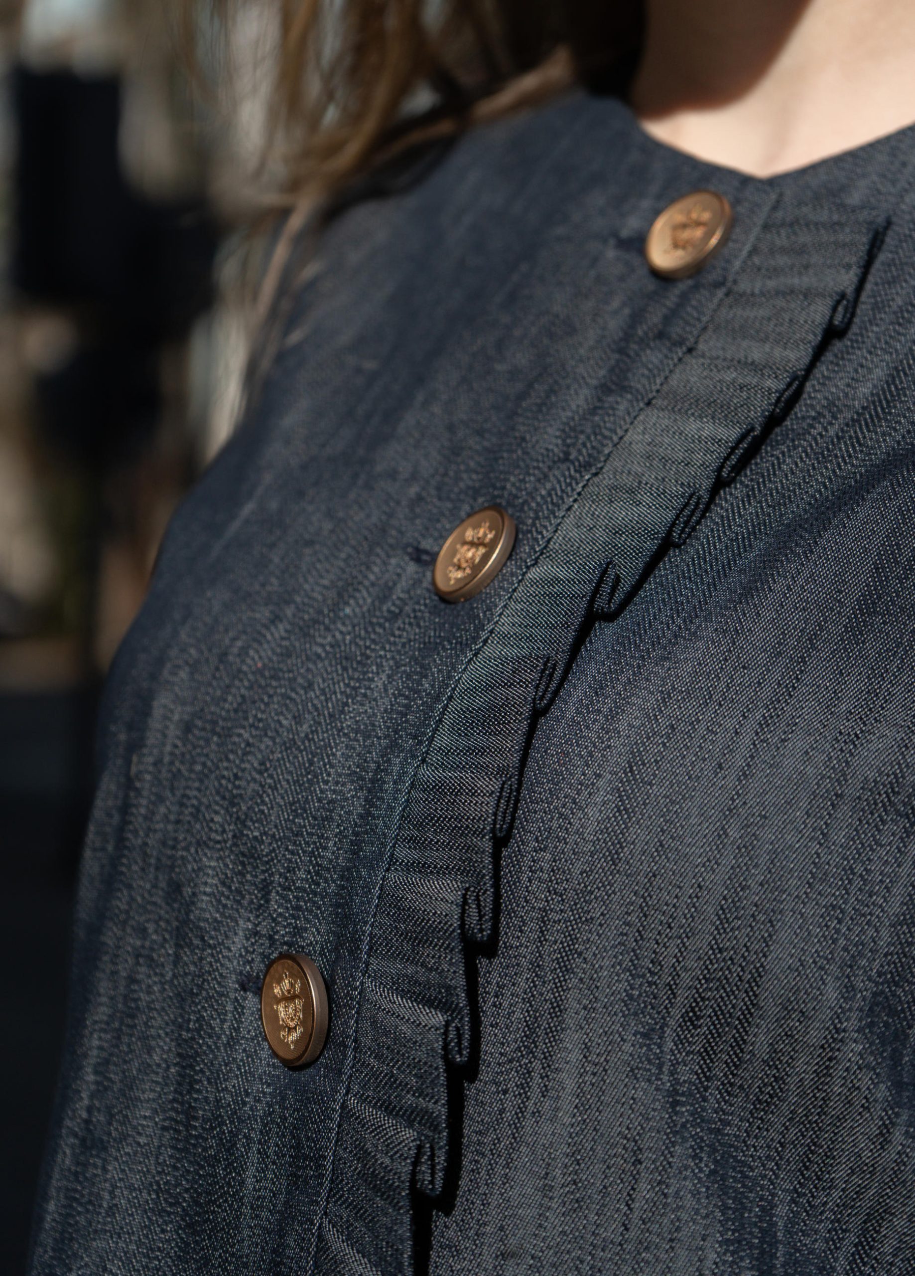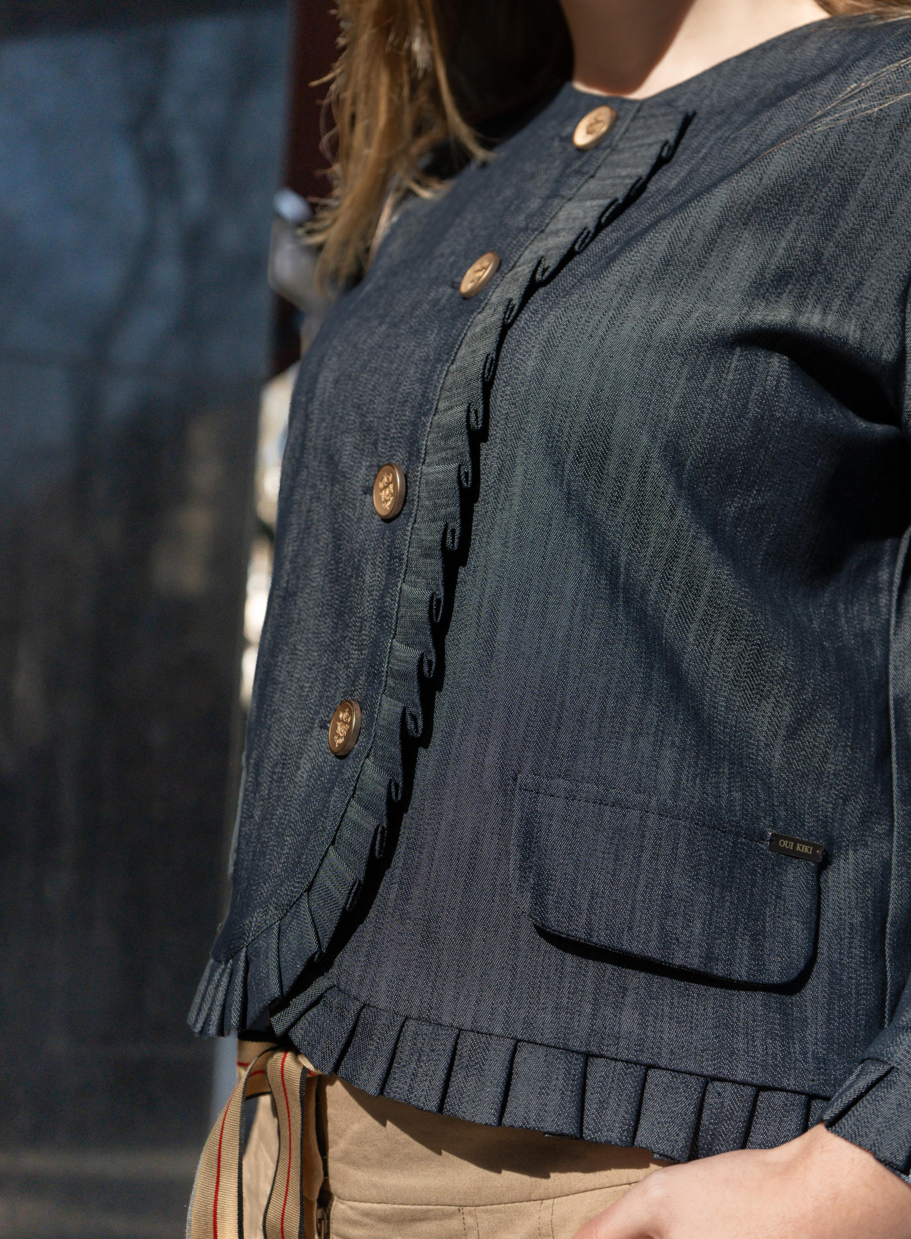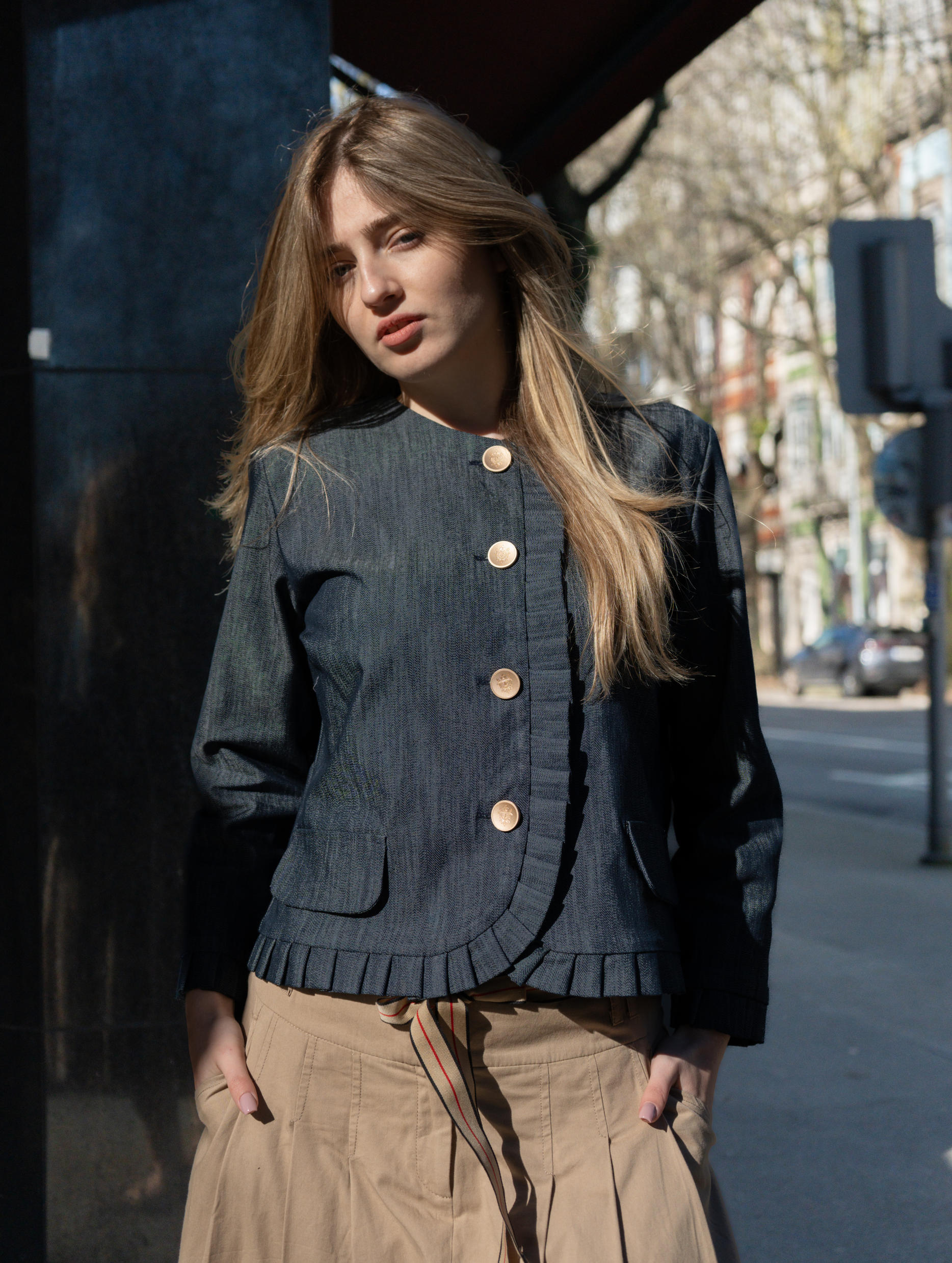 Casaco de ganga com folho a toda a volta , bolsos com pala, avivada no seu interior.