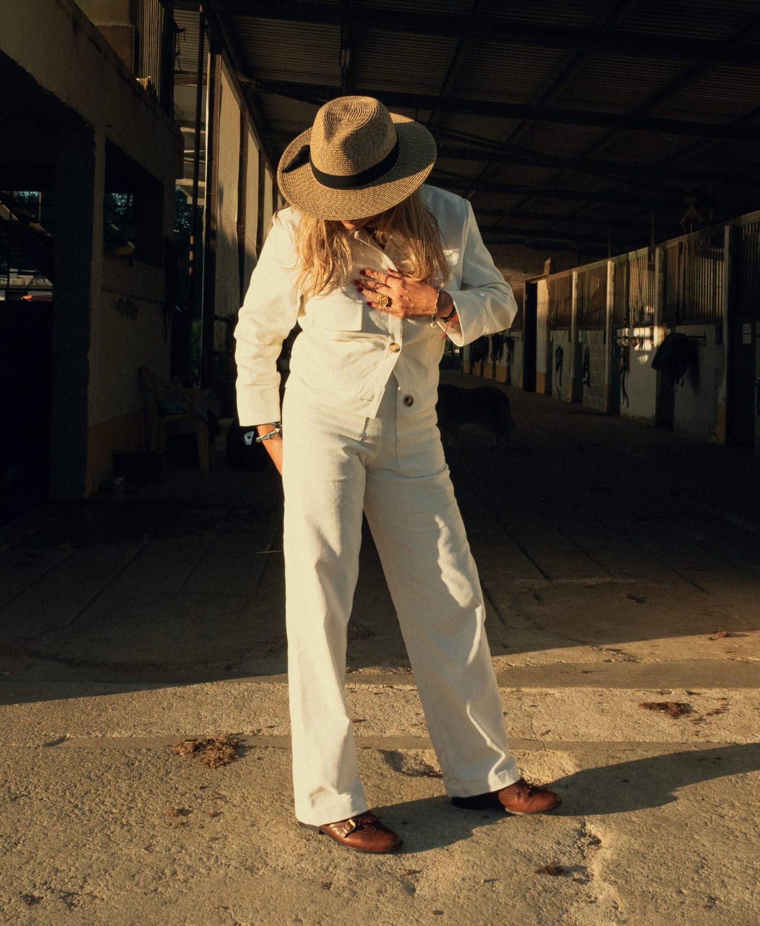 Calça cintura alta, fecho invisivel e bolsos em chapa.