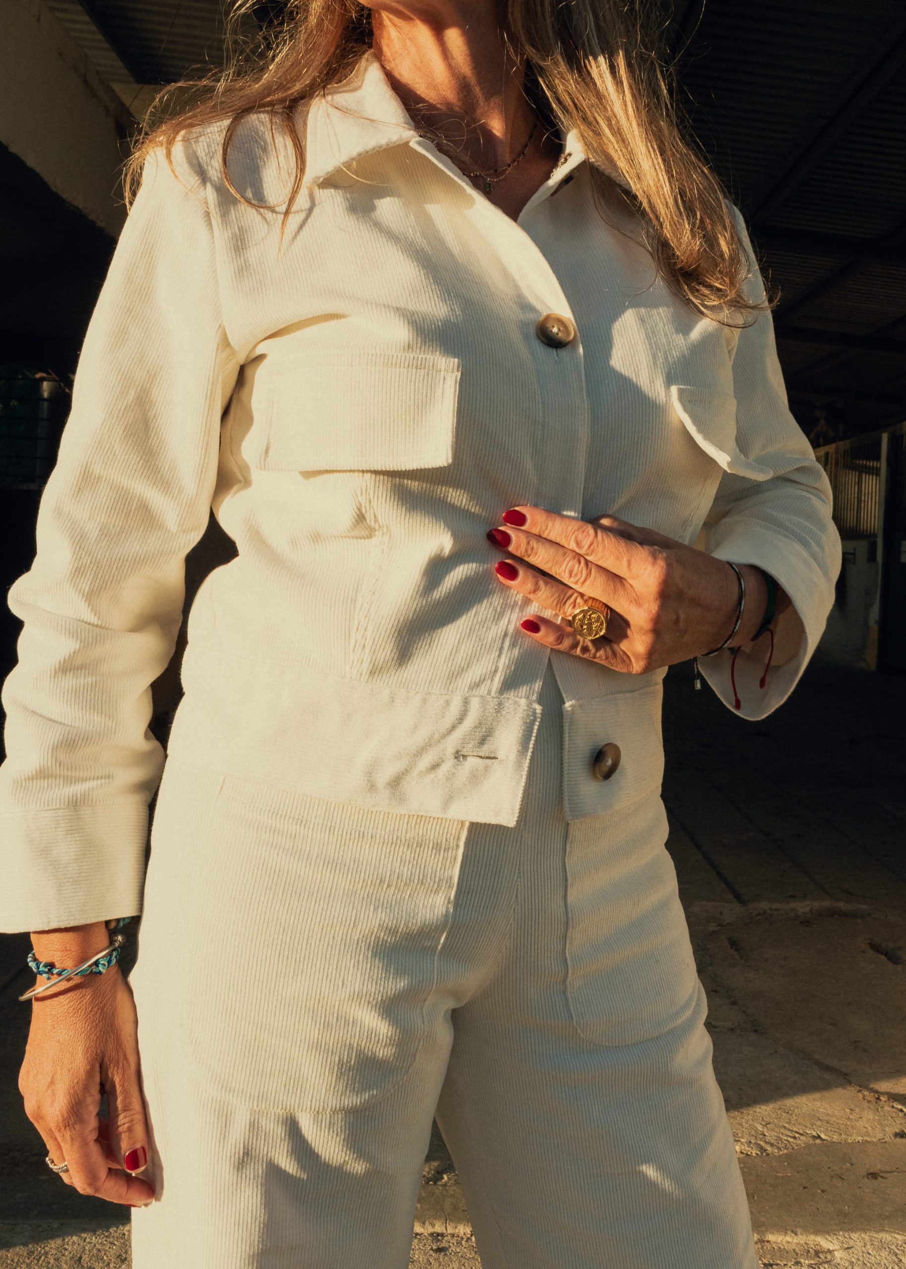 Casaco curto em bombazine, avivado tecido pied de poule, bolsos com pala e cotoveleira.