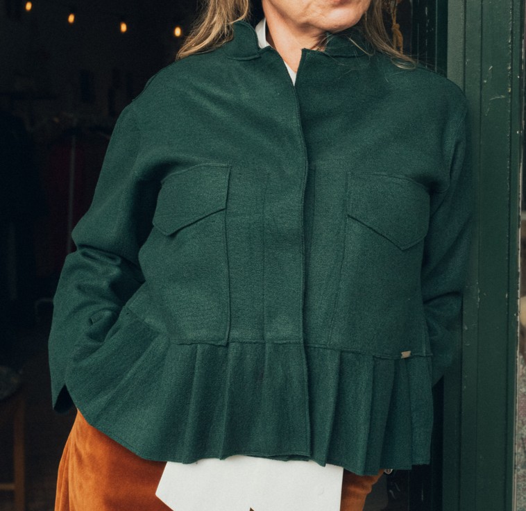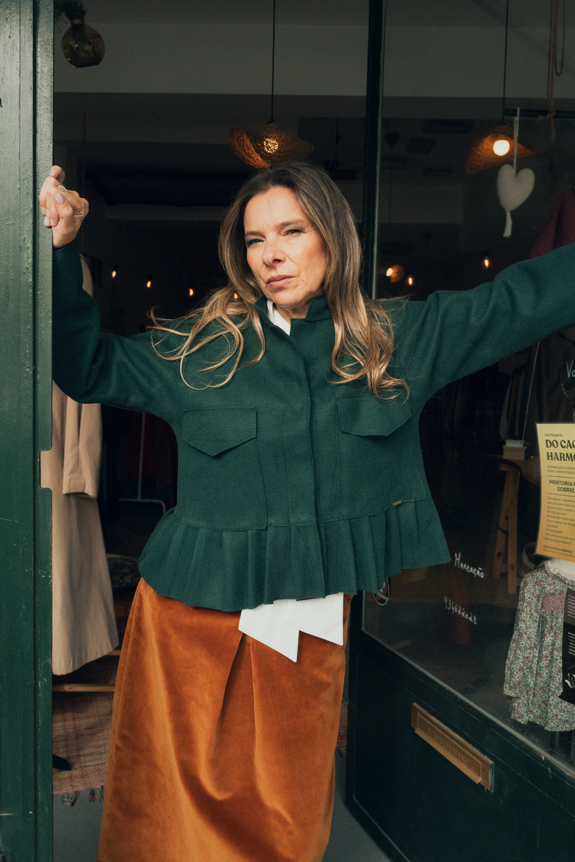 Modelo Casaco curto. Gola oficial. Manga comprida . Fecho de botões à frente. Folho na parte de baixo dando originalidade a peça.