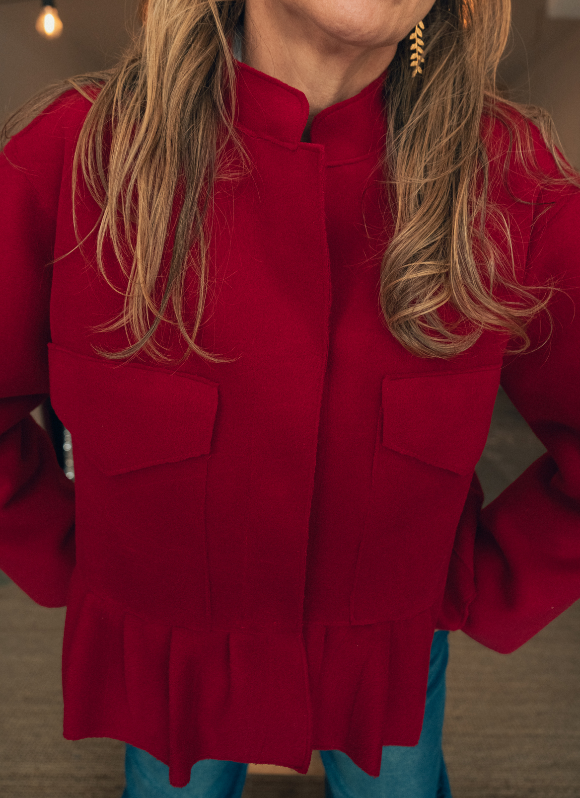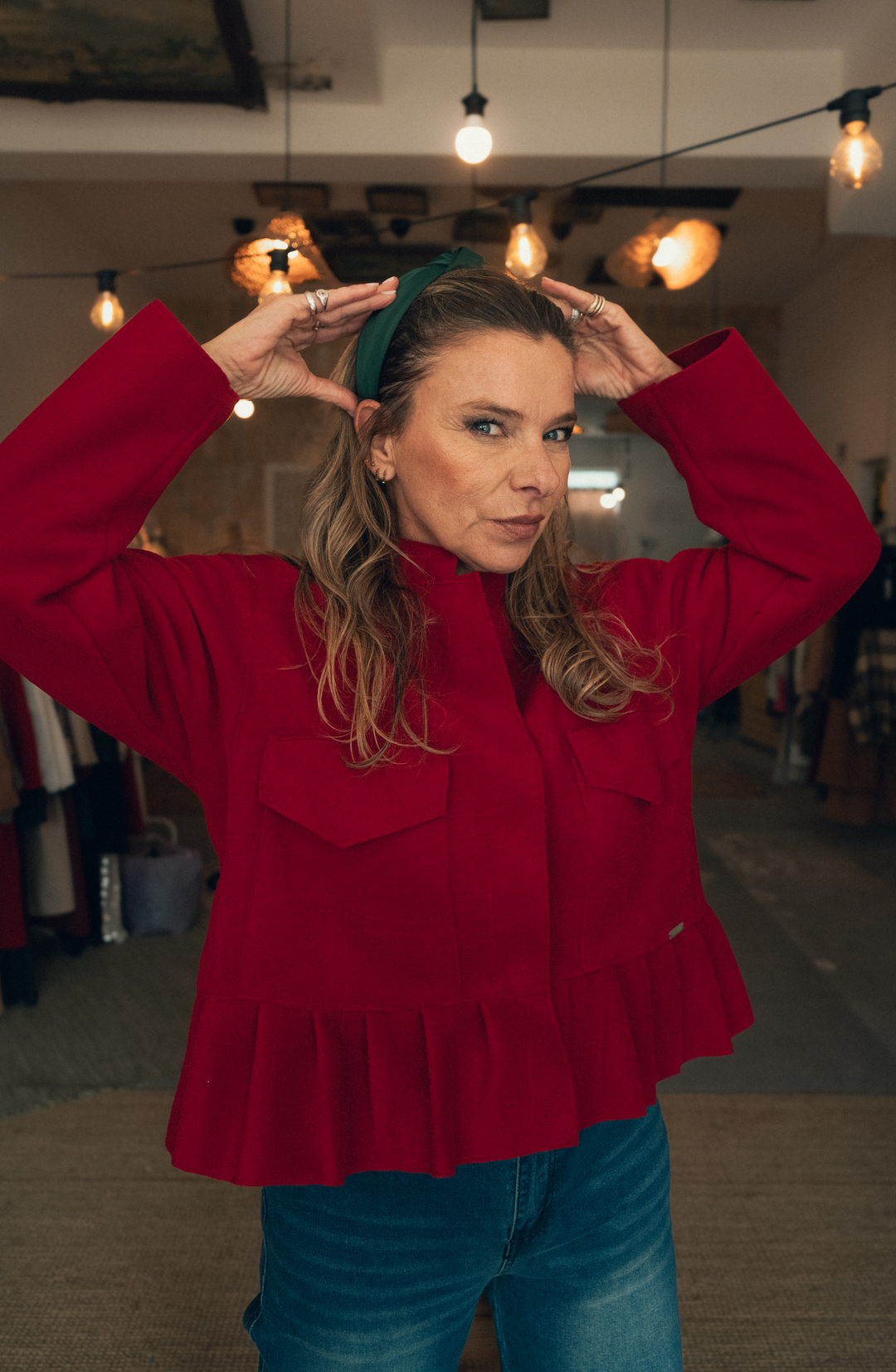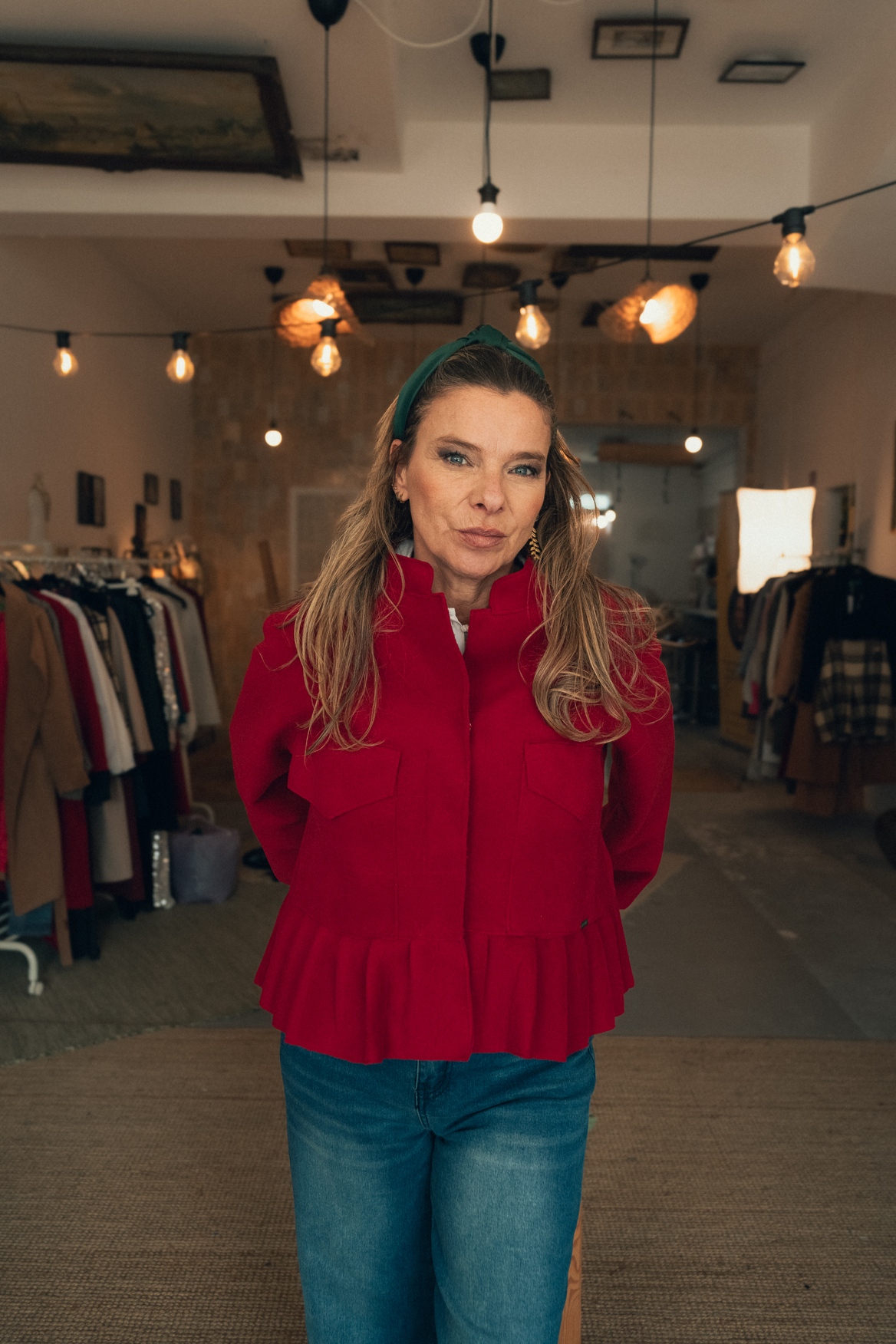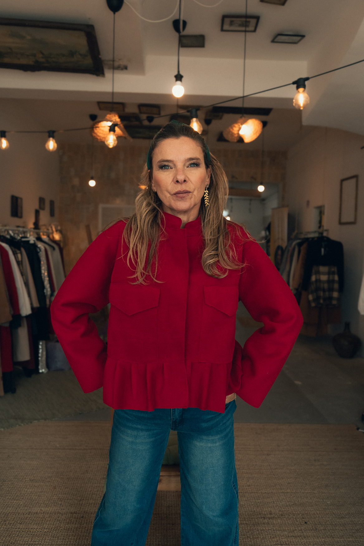Modelo Casaco curto. Gola oficial. Manga comprida . Fecho de botões à frente. Folho na parte de baixo dando originalidade a peça.