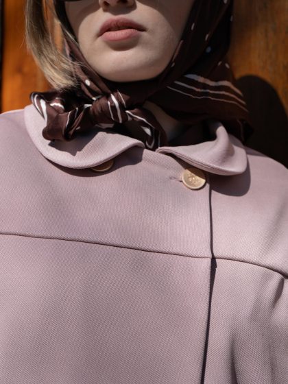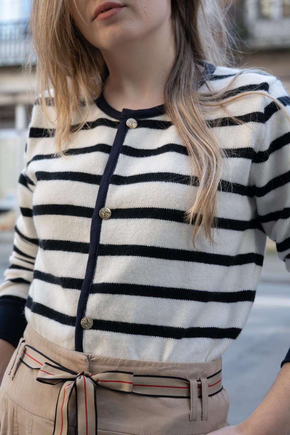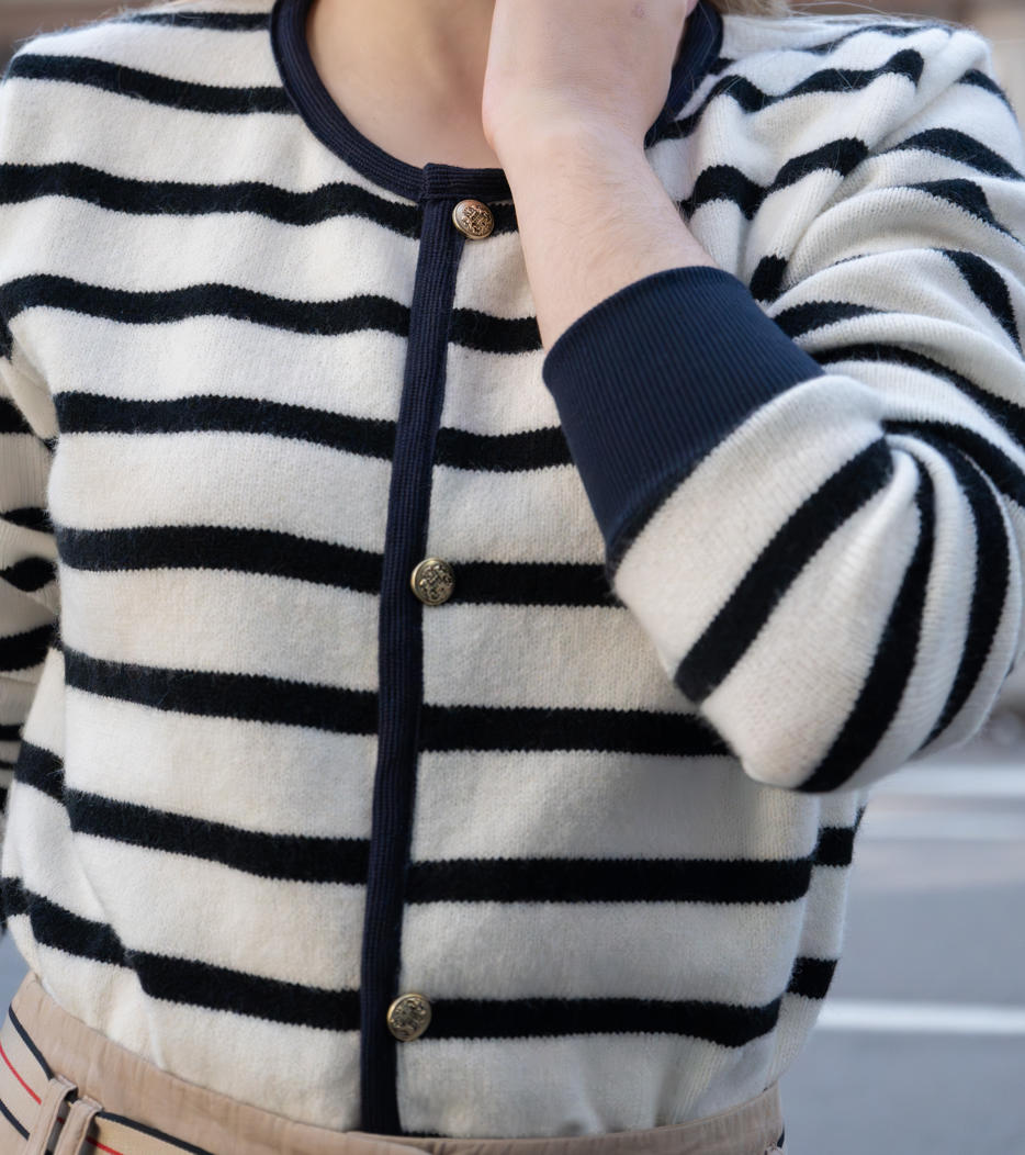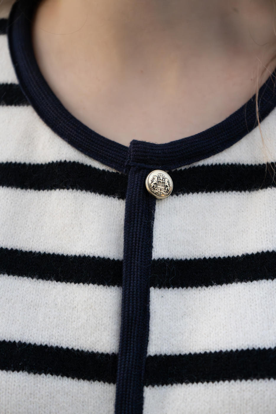 Casaco curto risca marinho, botão com brazão, punho em marinho dando um ar de bomber.