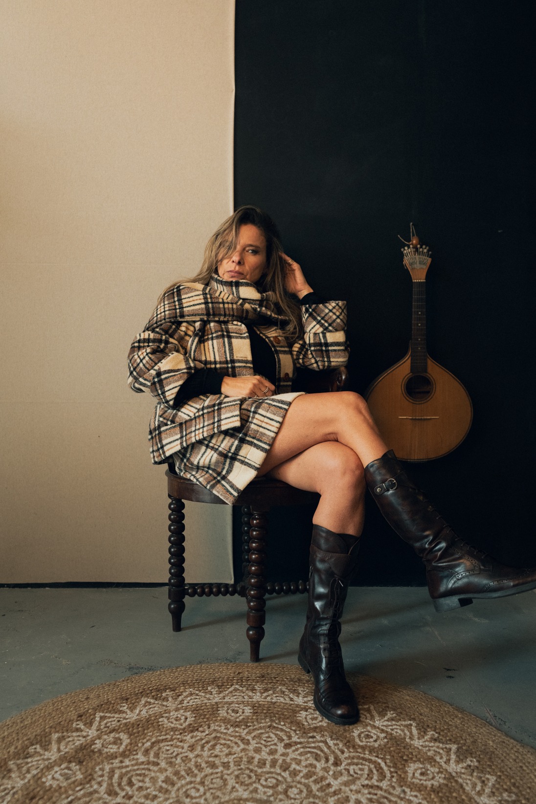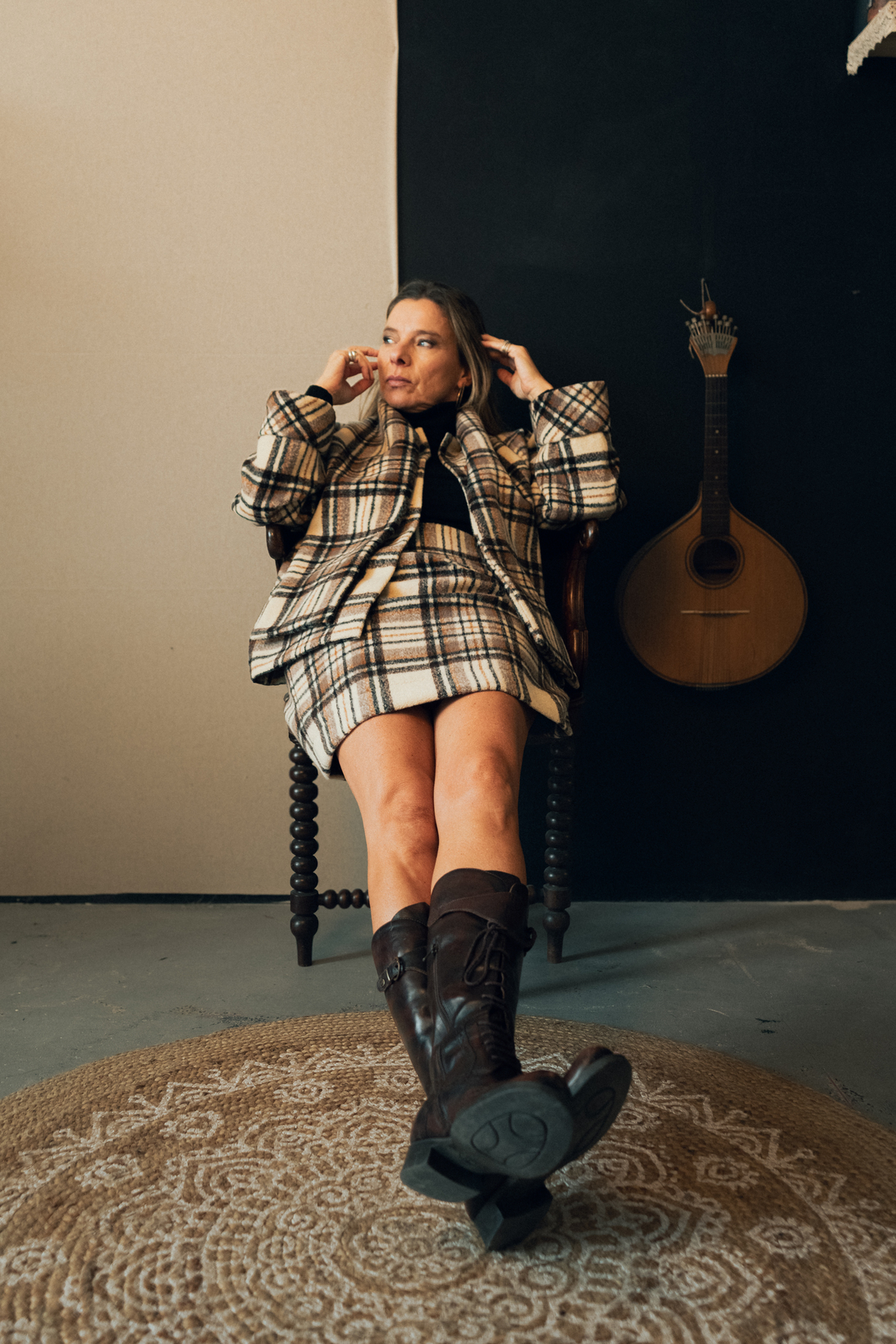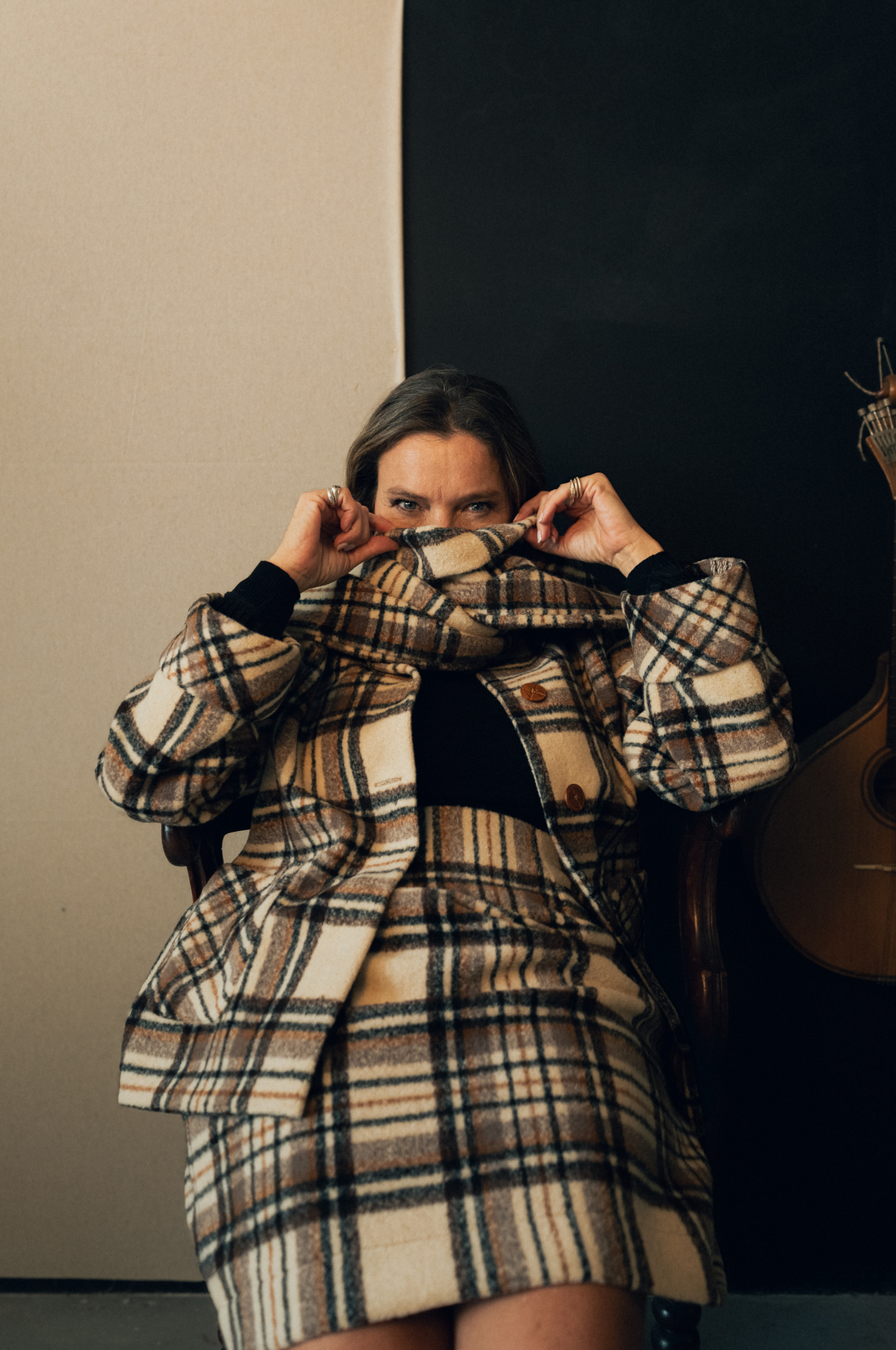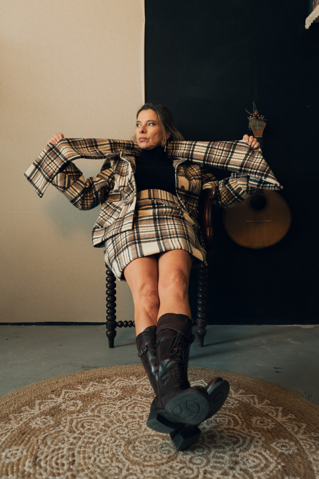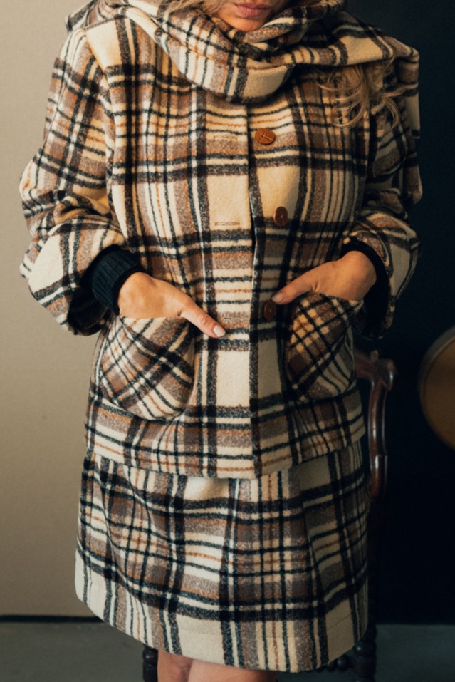 Casaco curto xadrez, botão madeira , bolsos chapa , cachecol ton sur ton e sem forro.