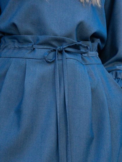Saia cintura subida com atilhos , fecho invisível na lateral, bolsos e avivada no seu interior.