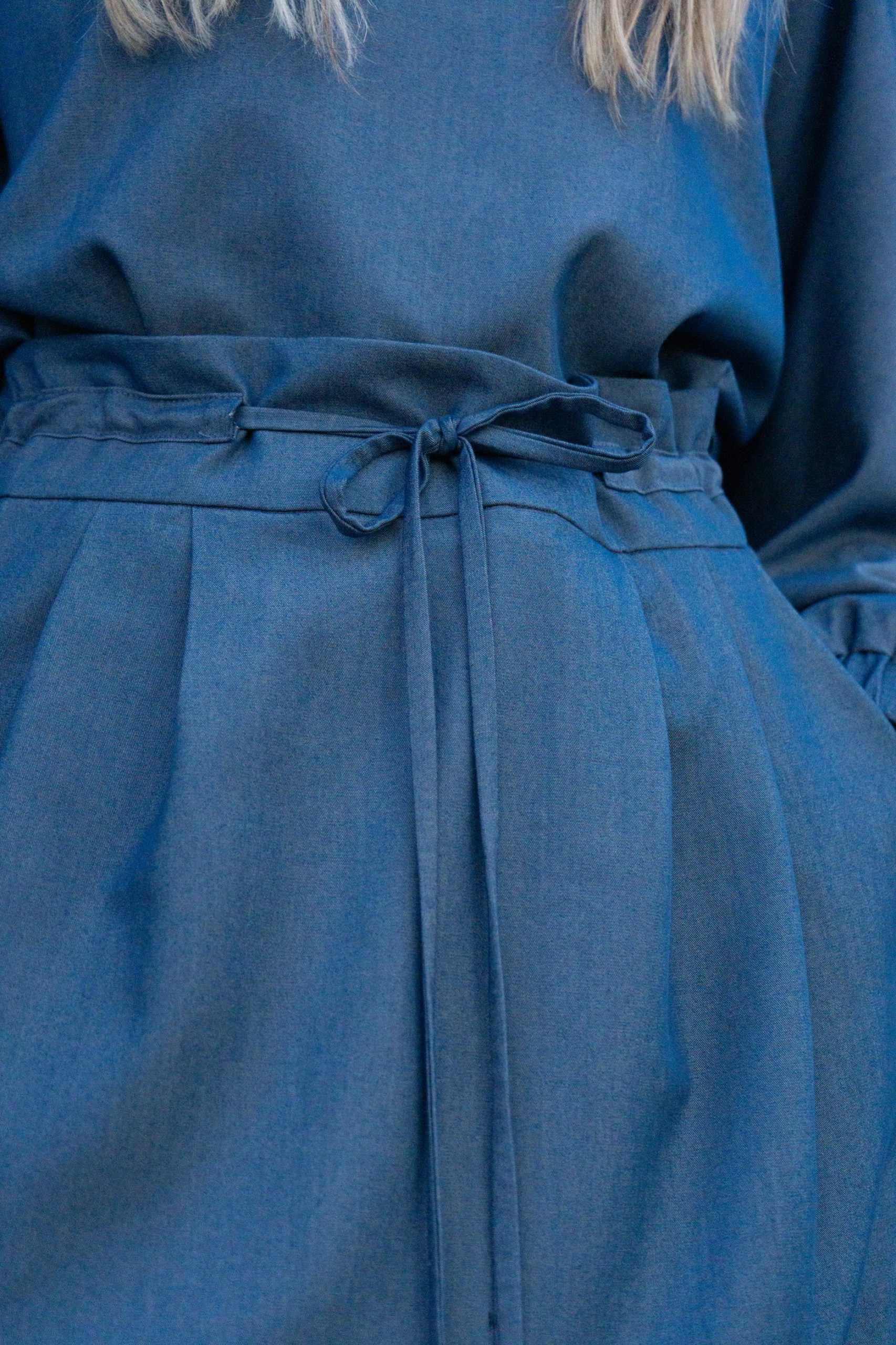 Saia cintura subida com atilhos , fecho invisível na lateral, bolsos e avivada no seu interior.