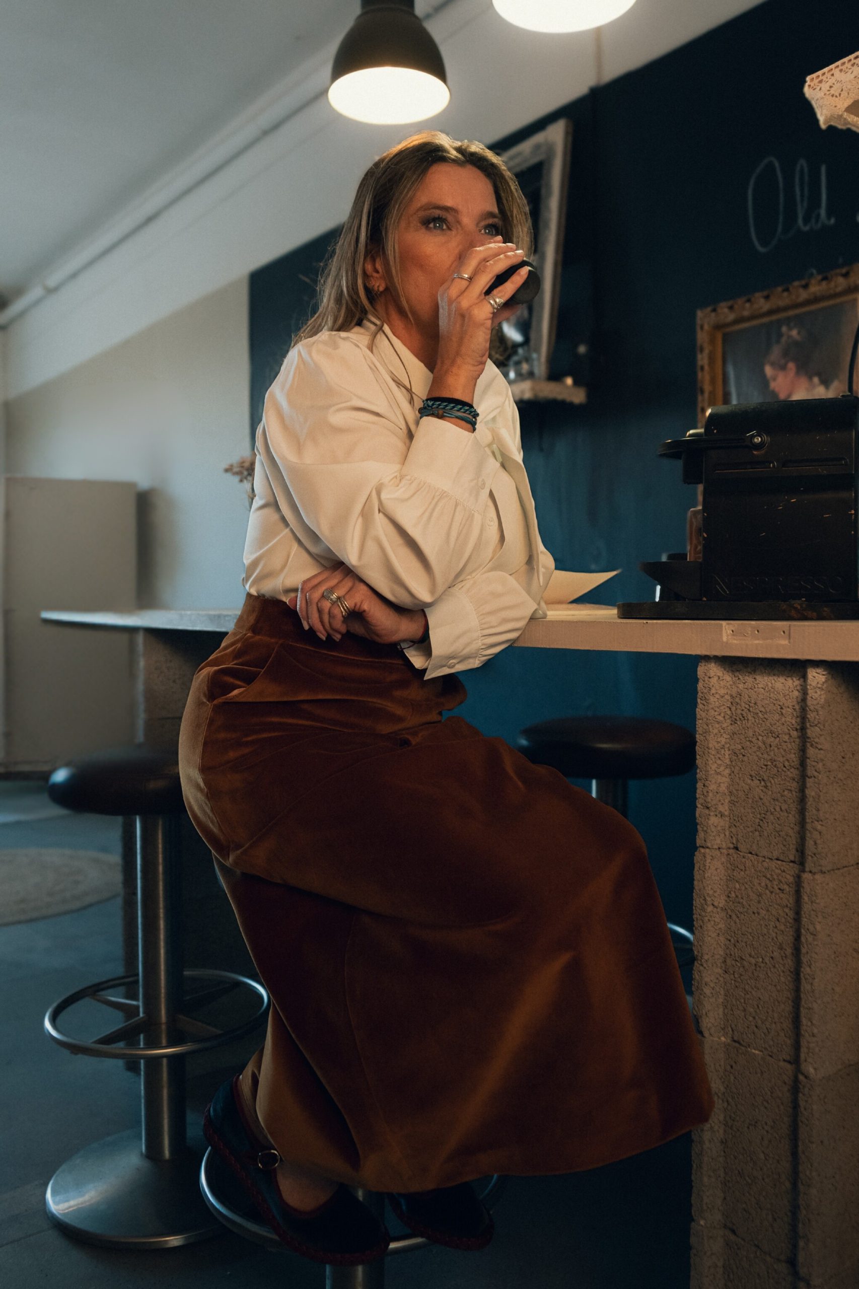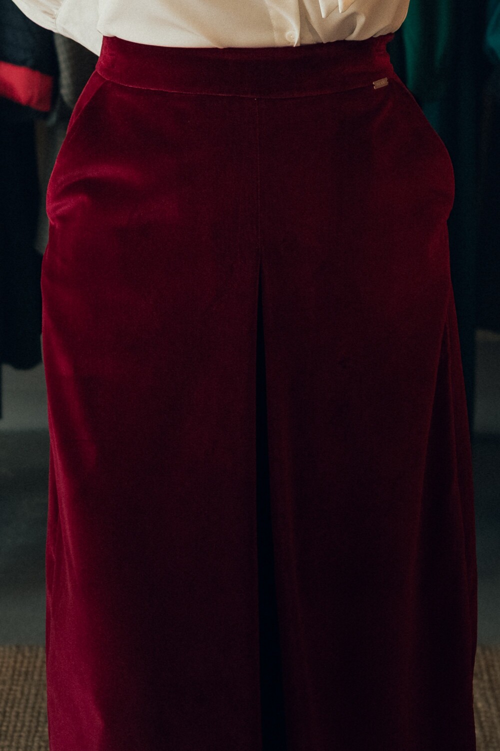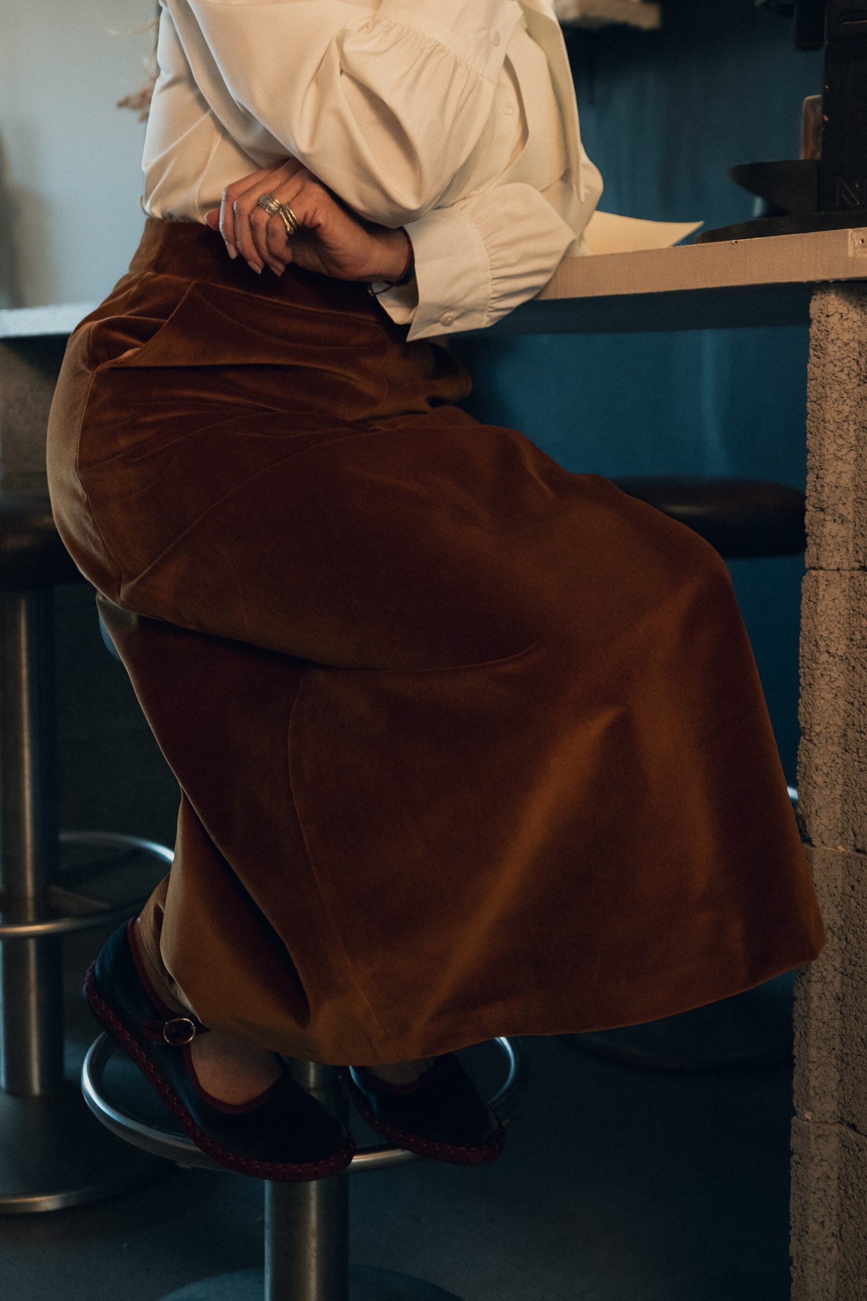 Saia midi em veludo, toda avivada com cetim no seu interior, bolsos e macho.