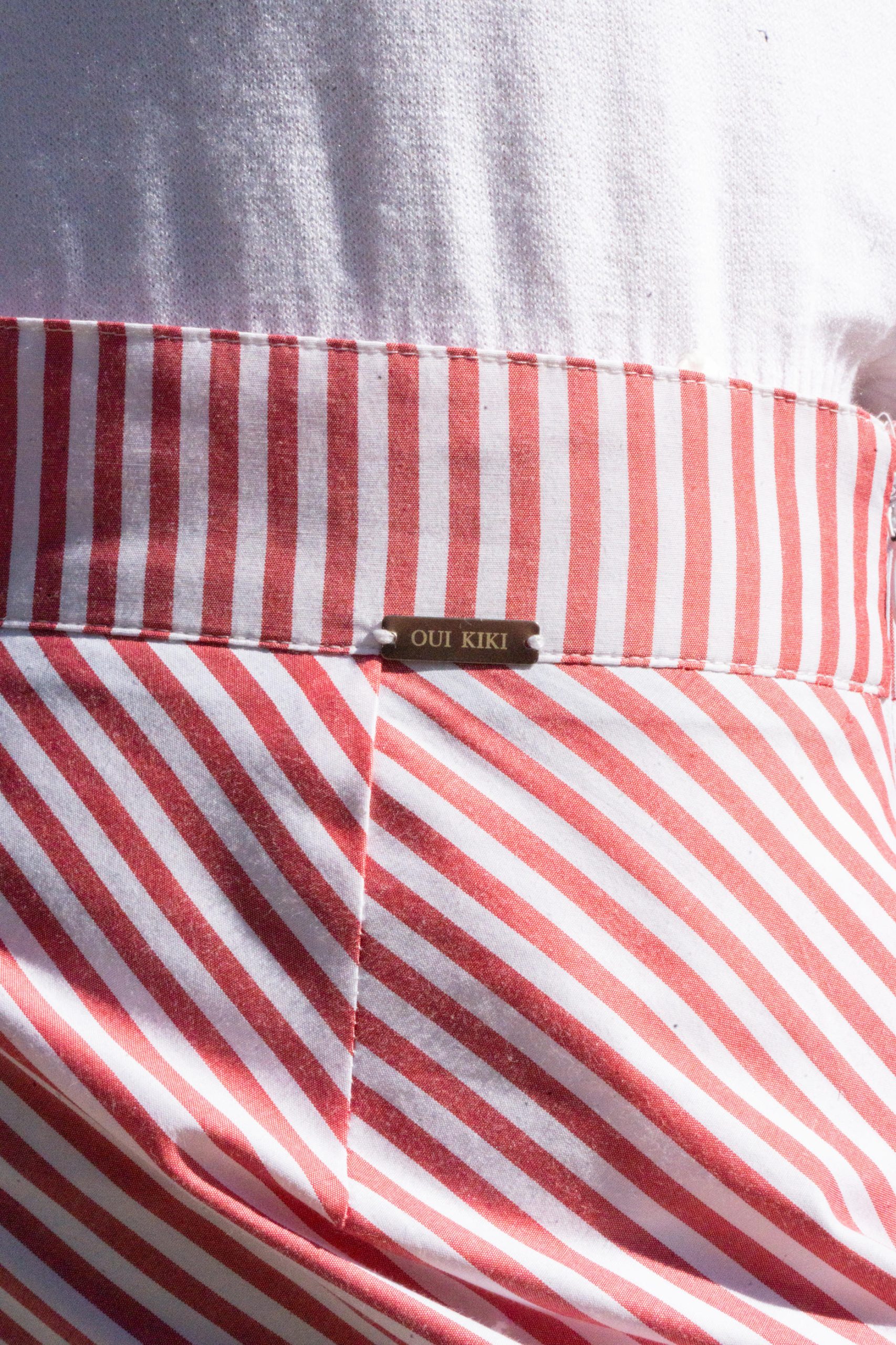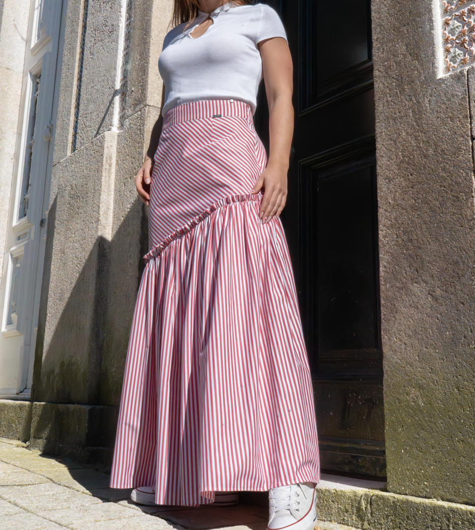 Saia às riscas, cintura subida com fecho invisível, folho na diagonal e avivada no seu interior.